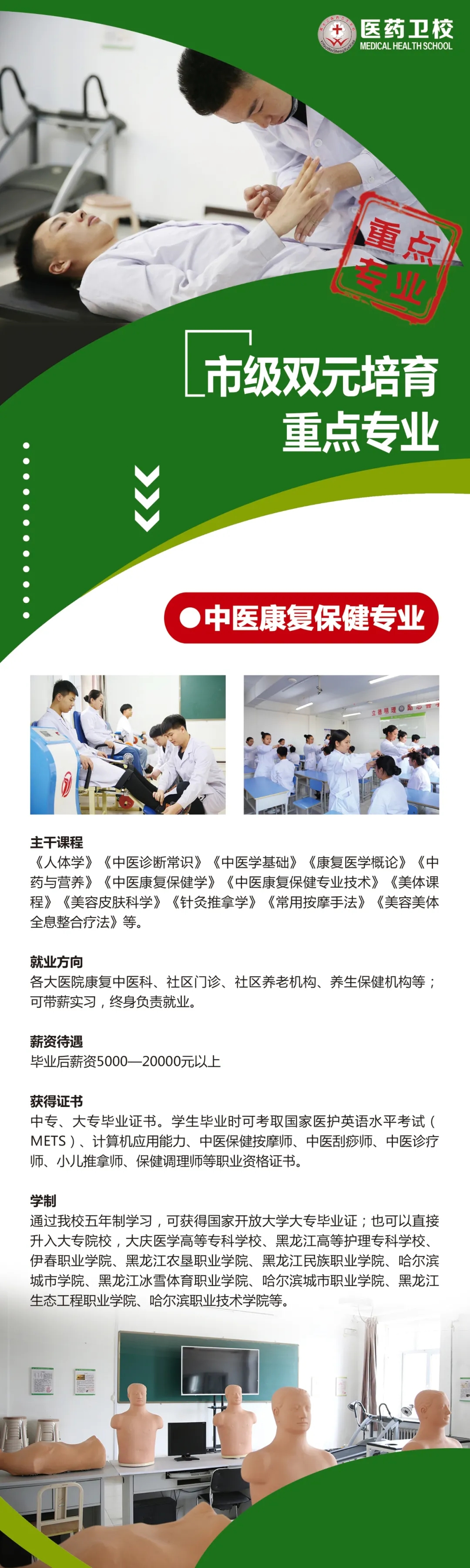 中醫(yī)健康保健事業(yè)的快速發(fā)展,需要一大批能直接提供康復(fù)保健服務(wù)的高技能中醫(yī)技術(shù)人才。我校專業(yè)上的成就不單能幫助本專業(yè)學(xué)生掌握更全面專業(yè)基礎(chǔ)理論和技能,更能幫助中醫(yī)保健事業(yè)培養(yǎng)和儲備更多優(yōu)質(zhì)人才。