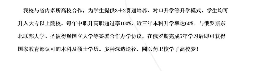 黑龍江醫(yī)藥衛(wèi)生學(xué)校辦學(xué)實力雄厚,以大學(xué)標準辦學(xué)。硬件條件設(shè)備先進,生活學(xué)習配套完善,學(xué)校地理區(qū)域景區(qū)環(huán)繞,智慧校園全國領(lǐng)先。在全國首先創(chuàng)新提出培養(yǎng)學(xué)生的九大職業(yè)核心素養(yǎng)、八大就業(yè)能力,實行升學(xué)、就業(yè)一體化辦學(xué)模式,構(gòu)建了素質(zhì)教育課程新體系。
