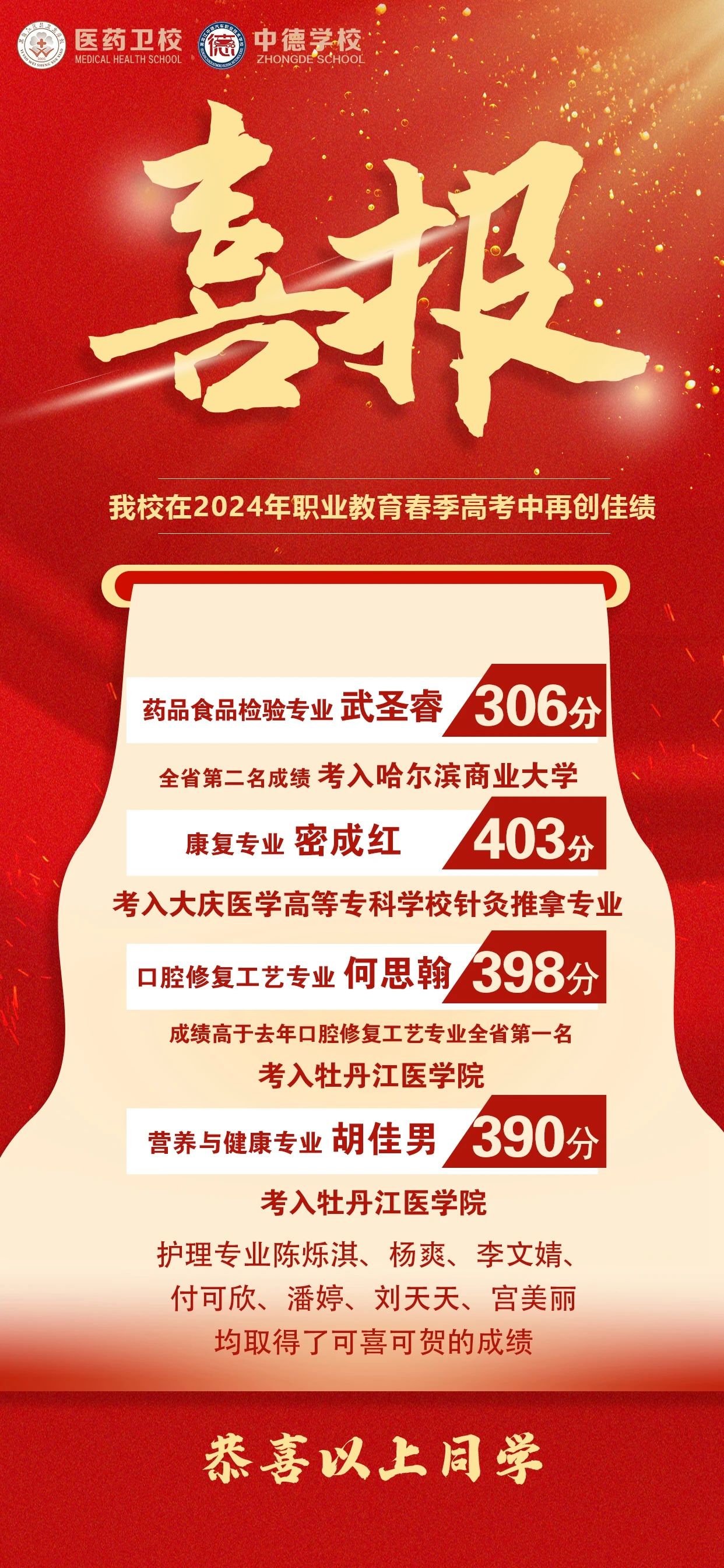 在2024年職業(yè)教育高考中,我校藥品食品檢驗(yàn)專業(yè)武圣睿同學(xué)以全省第二名的成績(jī)成功考進(jìn)哈爾濱商業(yè)大學(xué)??祻?fù)專業(yè)密成紅以403分考入大慶醫(yī)學(xué)高等??茖W(xué)校針灸推拿專業(yè)??谇恍迯?fù)工藝專業(yè)何思翰以398分(成績(jī)高于去年口腔修復(fù)工藝專業(yè)全省第一名)考入牡丹江醫(yī)學(xué)院。營(yíng)養(yǎng)與健康胡佳男390分考入牡丹江醫(yī)學(xué)院。護(hù)理專業(yè)陳爍淇,楊爽,李文婧,付可欣,潘婷,劉天天,宮美麗均取得了可喜可賀的成績(jī)。